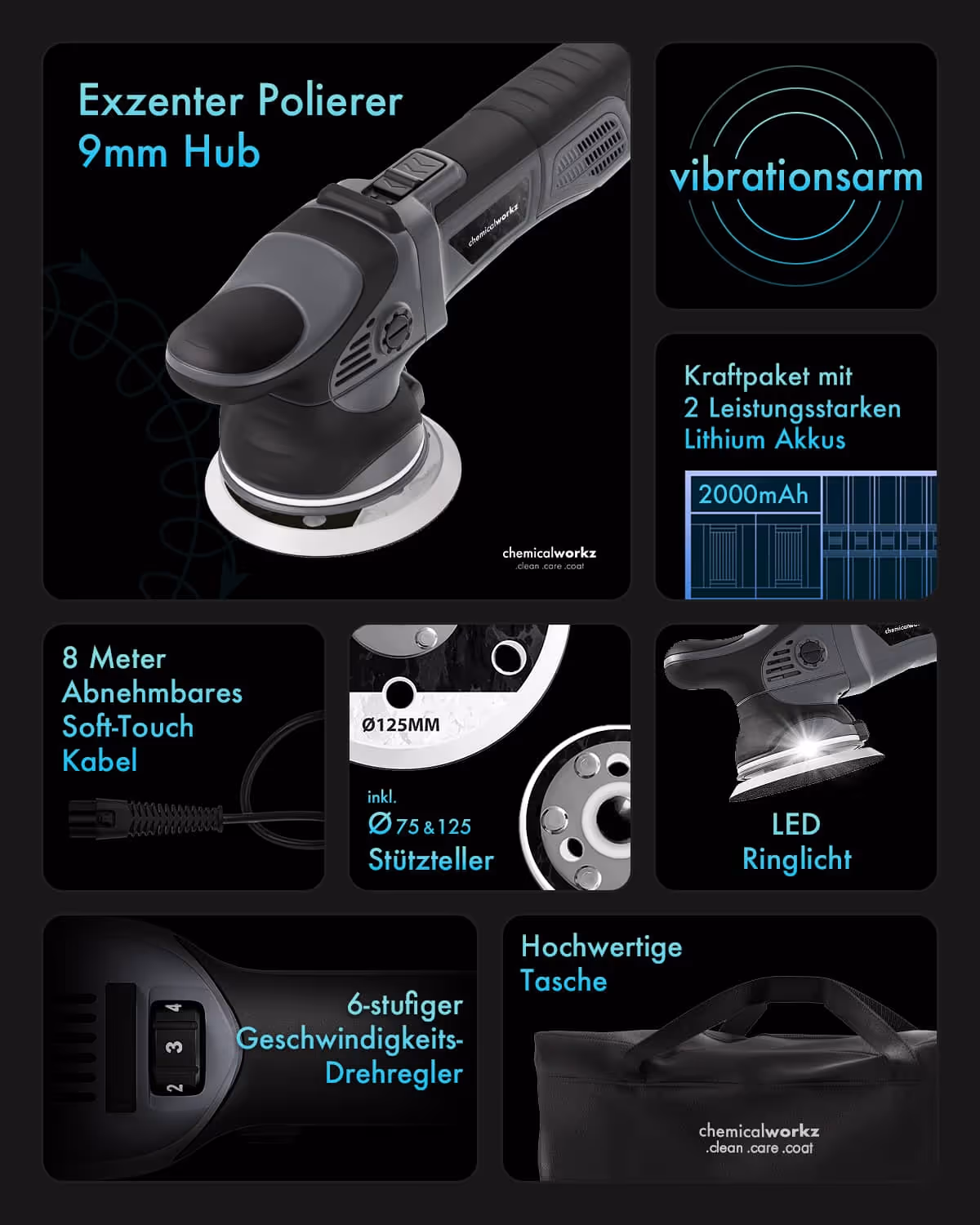 Die chemicalworkz DA9 Pro erreicht in allen Testkategorien die höchstmögliche Punktzahl von 30 und überzeugt damit in einem umfassenden Gesamteindruck. Ihr Konstruktionsprinzip basiert auf einer hochwertigen Verarbeitungsqualität mit widerstandsfähigen Materialien, die auch unter intensiver Beanspruchung eine konstante Leistung gewährleistet. Die getesteten Einsatzszenarien bestätigten eine effiziente Kraftübertragung, wodurch sich die Maschine für unterschiedlichste Lackzustände eignet. Die ergonomische Gestaltung ermöglichte eine präzise Führung und ermüdungsfreies Arbeiten, während die geringe Vibrationsentwicklung und die intuitive Bedienbarkeit die Anwendung zusätzlich erleichterten. Besonders auffällig war die konstante Drehzahlkontrolle, die selbst unter hoher Last eine gleichmäßige Performance sicherstellte. Die getesteten mechanischen Komponenten, einschließlich der Stützteller und der Befestigungssysteme, zeigten keine Schwächen oder Instabilitäten, was auf eine durchdachte Konstruktionsweise schließen lässt. Die Wärmeentwicklung blieb auch bei längerer Nutzung im unkritischen Bereich. Die Ergebnisse im Bereich Wartung und Pflege unterstreichen die Langlebigkeit der eingesetzten Materialien. Die Reinigung gestaltete sich unkompliziert, und die Materialbeständigkeit gegenüber externen Einflüssen konnte bestätigt werden. Die Testergebnisse verdeutlichen, dass die chemicalworkz DA9 Pro auf eine dauerhafte Nutzung ausgelegt ist und eine konstante Leistung über verschiedene Belastungsszenarien hinweg gewährleistet.