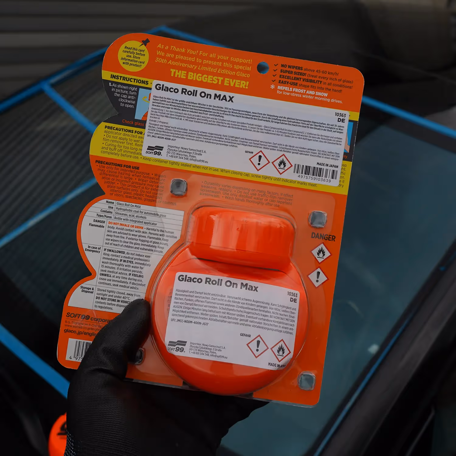 Application: Clean the windshield, apply in a cross pattern, allow to flash off for 5–10 min, wipe off – quick, self-explanatory, and tolerant of minor errors. Disposable gloves and fresh air are advisable (noticeable alcohol odor). In practice, it’s hard to do anything wrong.