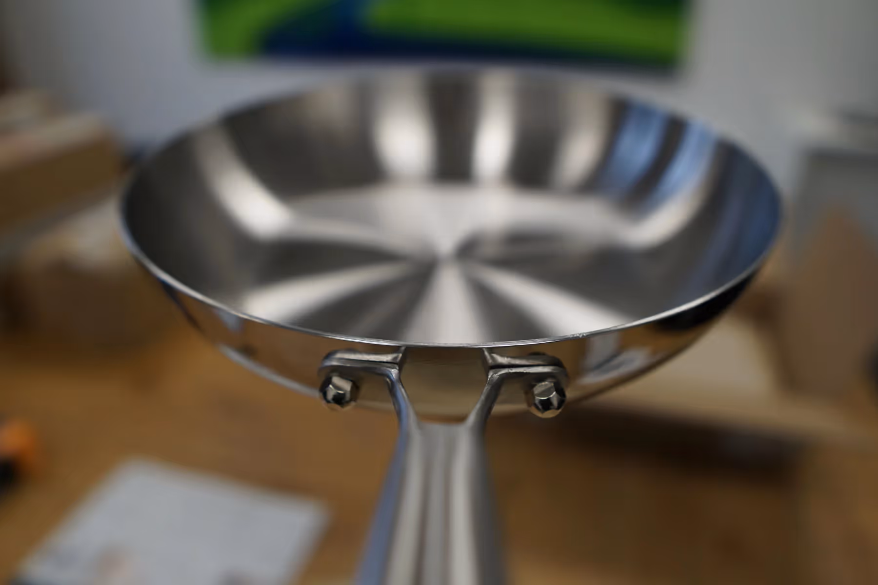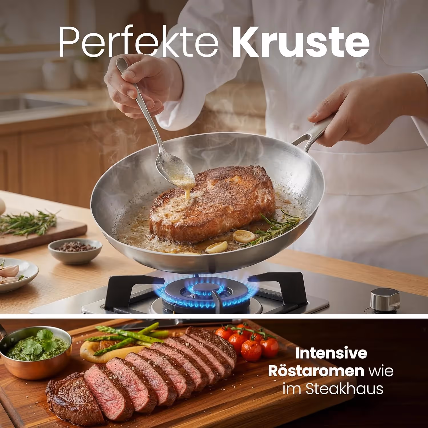 Compatibility & material properties: The pan is suitable for all standard types of hobs, including induction, and can also be used in the oven up to 400 °C. Stainless steel is robust and resistant to standard kitchen utensils — metal spoons or spatulas are also generally suitable. Visible signs of use and fine scratch lines on the interior are typical; these are usually purely visual and significantly less critical in the case of stainless steel than with coated pans, as no coating can be damaged.