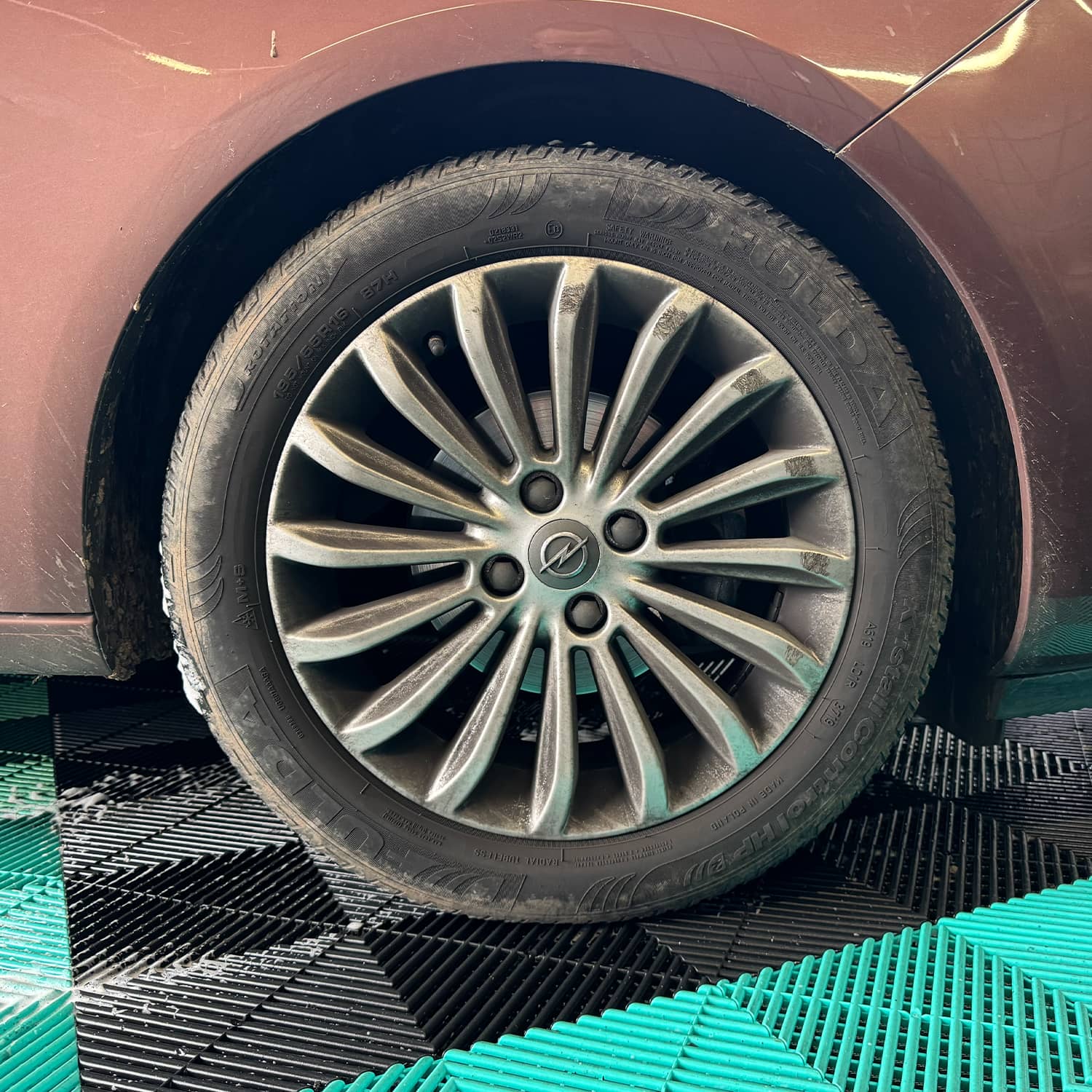Anwendung: Im Praxistest wurde der Reiniger bei etwa 10 °C in der Waschbox auf unterschiedlichen Felgentypen eingesetzt (u. a. Aluminium-, lackierte und glanzgedrehte Felgen sowie Vorschädigungen). Die Flasche wirkt bereits beim ersten Kontakt hochwertig und ist dank klarer Kennzeichnung sowie gut lesbarer Anwendungs- und Sicherheitshinweise unmittelbar einsatzbereit. Die Anwendung folgt einem typischen Schema: Felgen abkühlen lassen, Reiniger vollflächig aus verschiedenen Winkeln aufsprühen, drei bis fünf Minuten einwirken lassen und anschließend gründlich abspülen. Die gelartige Konsistenz haftet lange auf der Oberfläche, was die Schmutzlösung spürbar unterstützt.