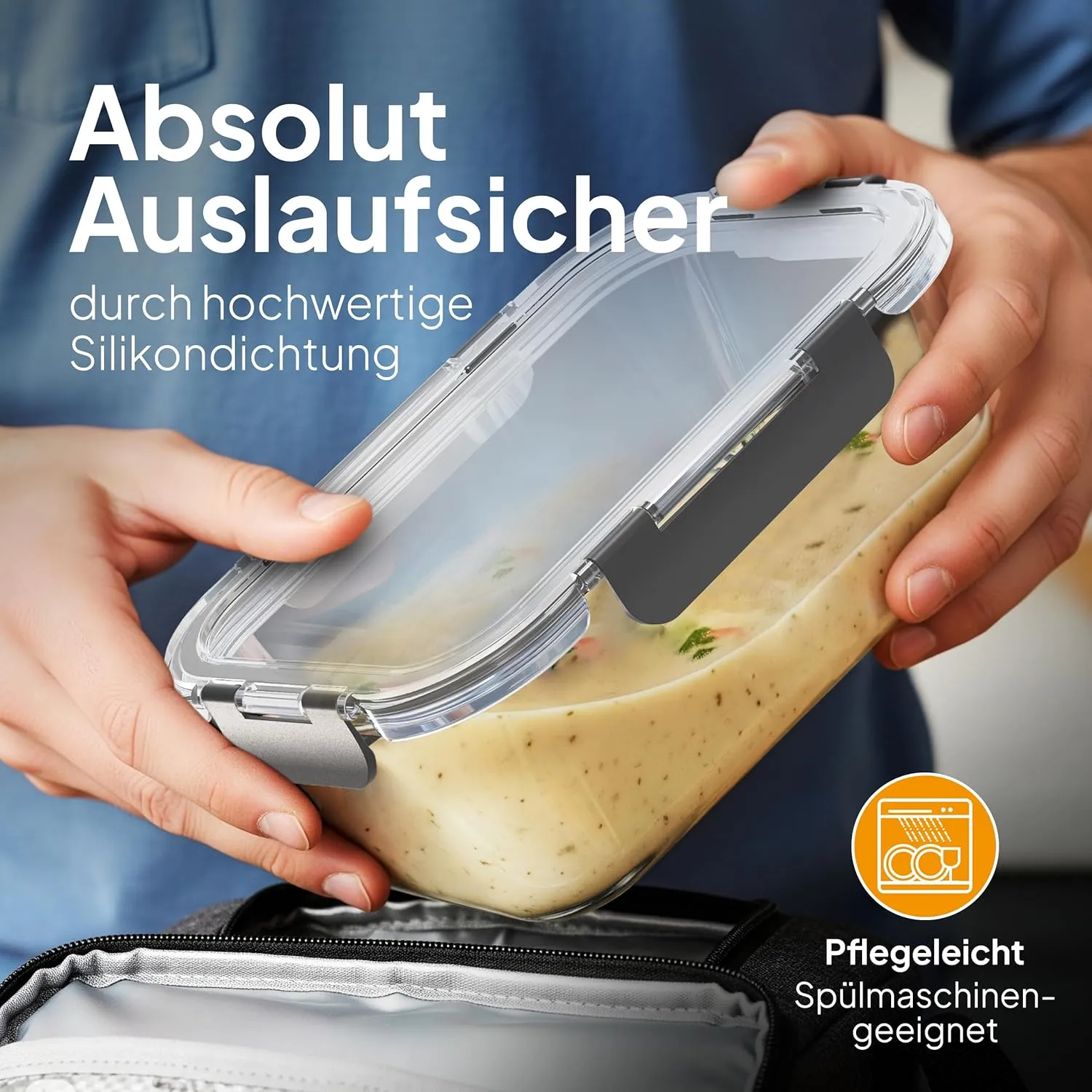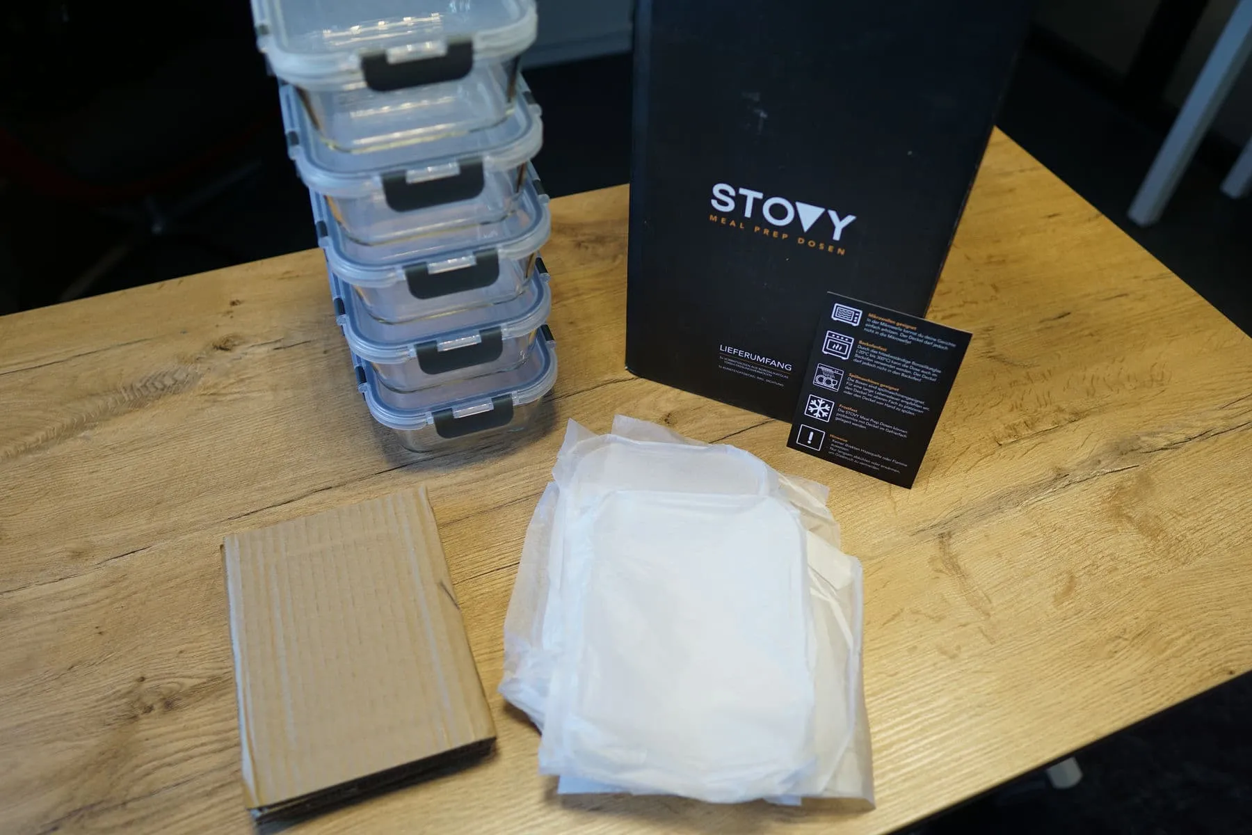 Meal-Prep-Boxen sollen im Alltag vor allem eines leisten: Speisen sicher aufbewahren, sich angenehm handhaben lassen und die Vorbereitung mehrerer Mahlzeiten praktisch machen. Die fünf Boxen hinterließen bereits beim Auspacken einen sehr ordentlichen und hochwertigen Eindruck. Sie kamen in einer stabilen schwarzen Verpackung an, im Inneren sauber gestapelt und zusätzlich durch Zwischenlagen geschützt, sodass die Glasbehälter unversehrt und ohne sichtbare Kratzer ankamen.